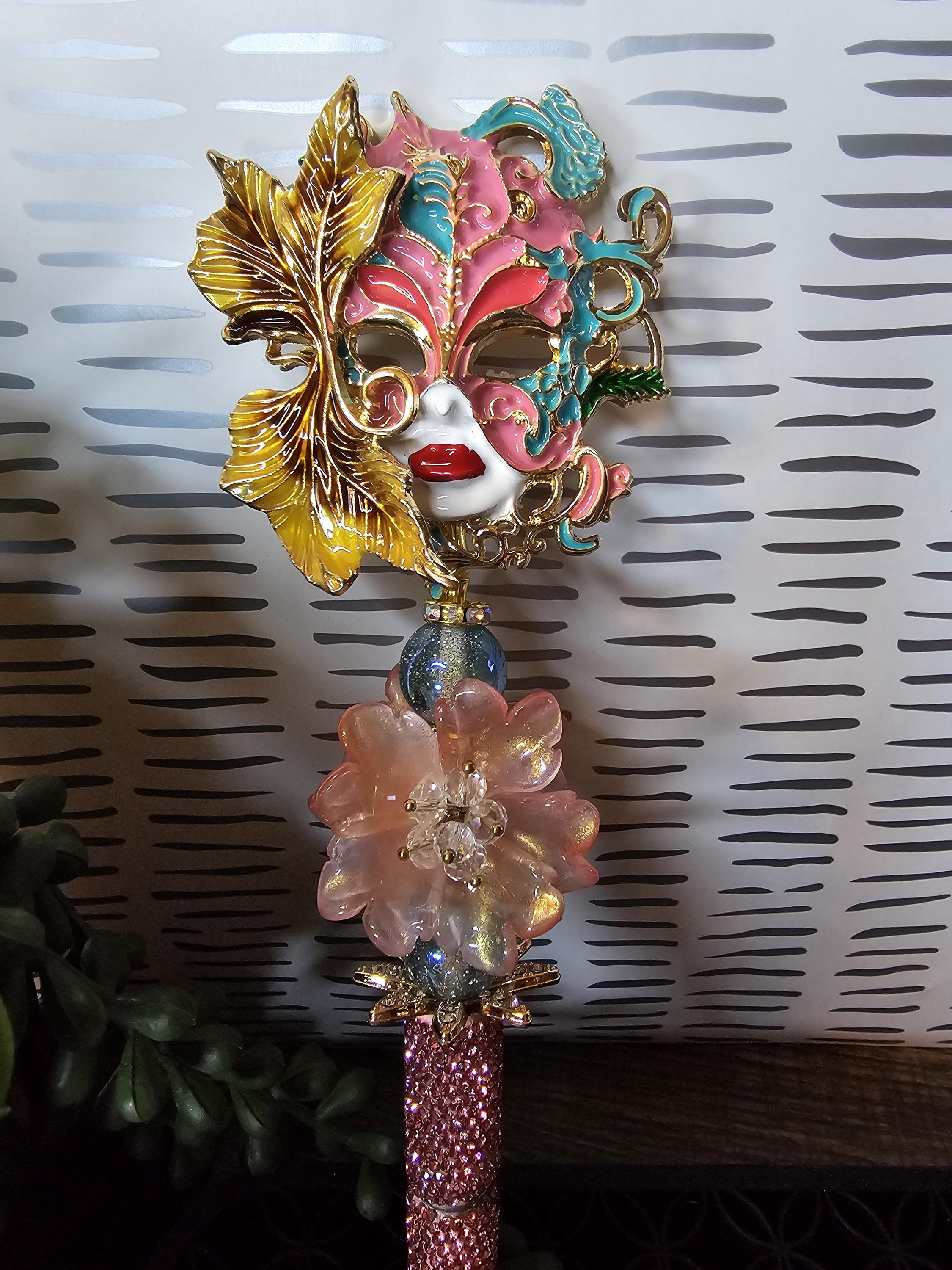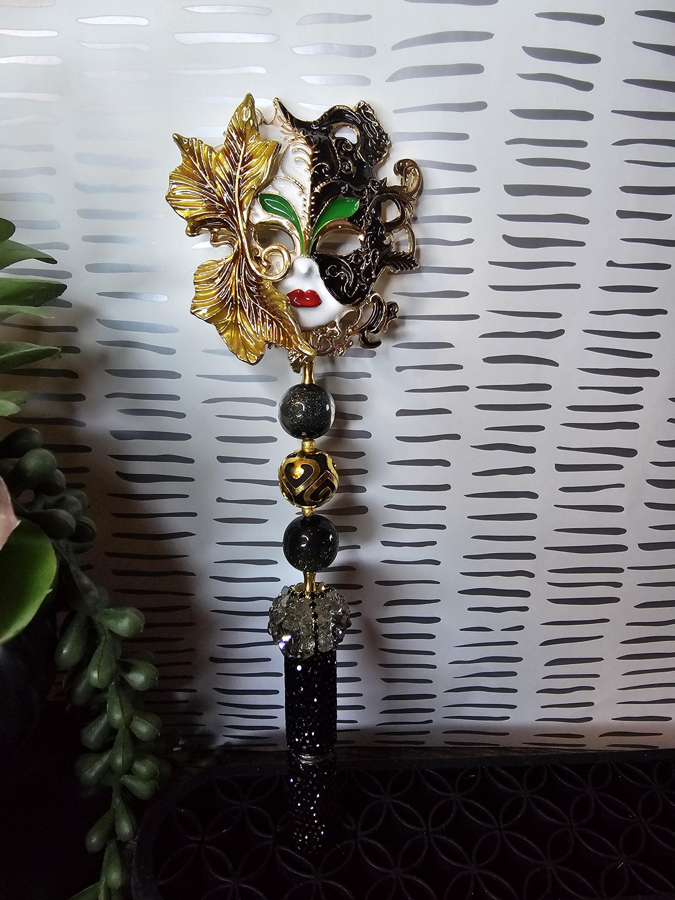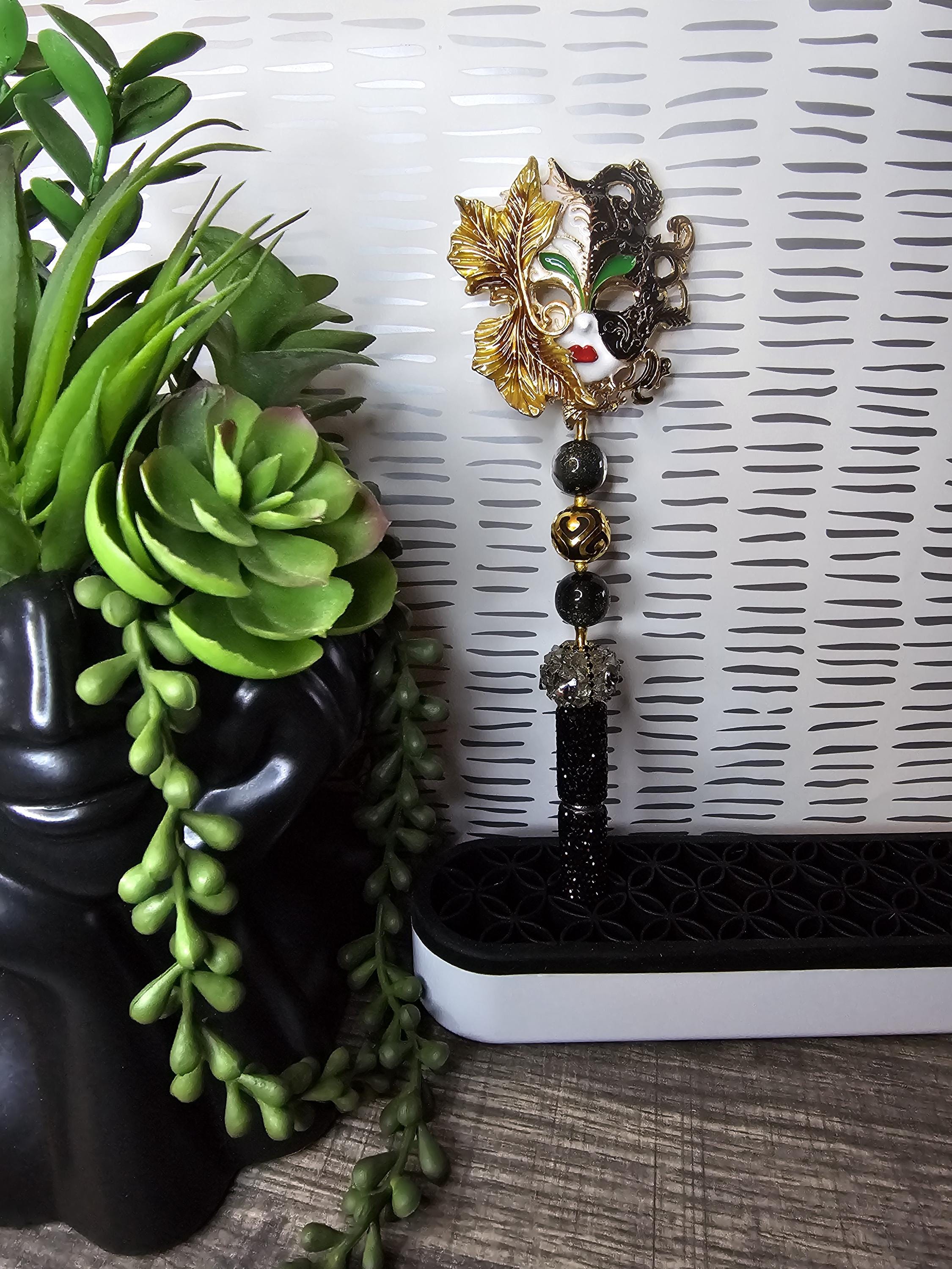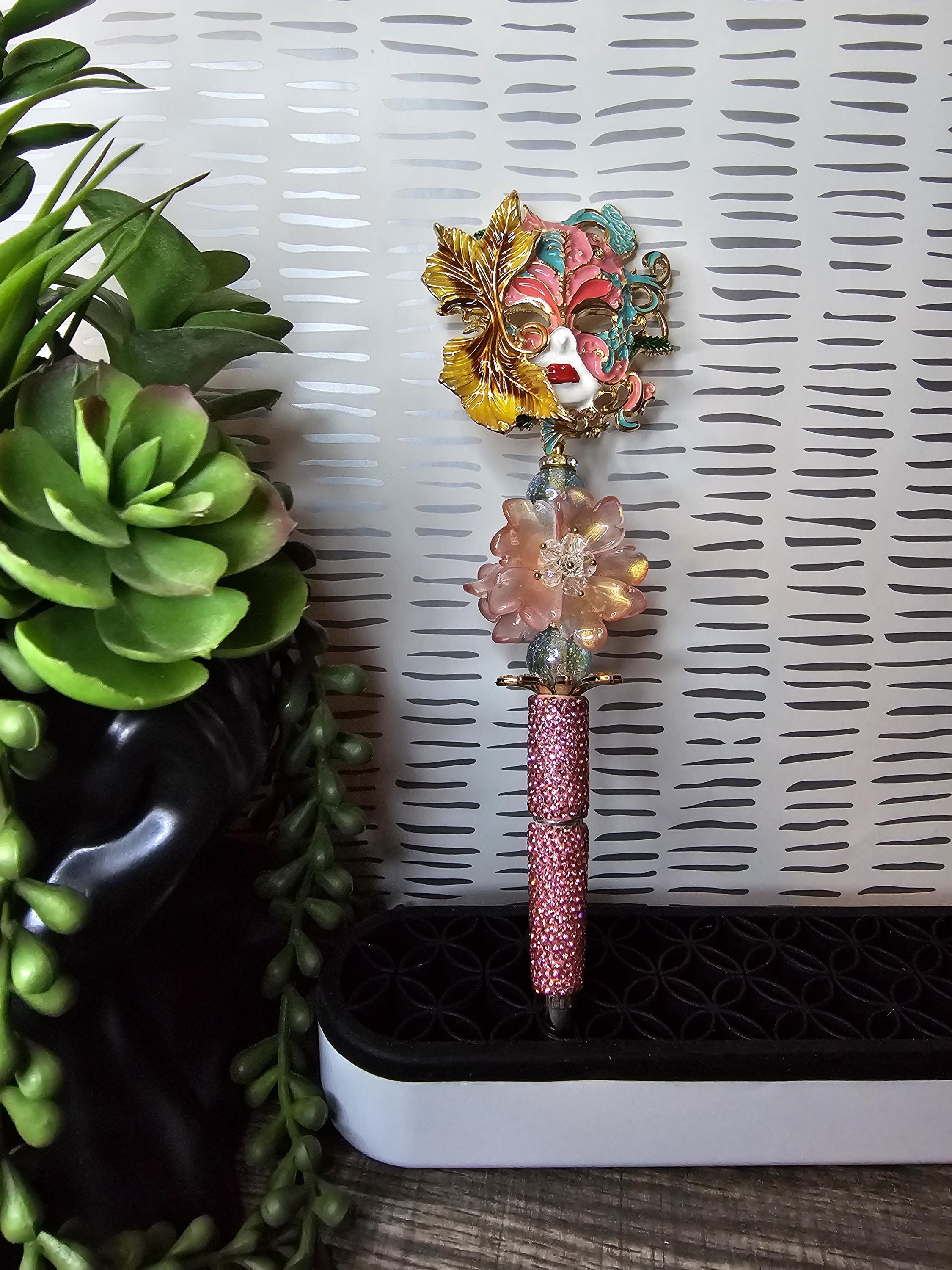 Add a touch of mystery and elegance to your everyday writing! This luxury beaded pen features a stunning Venetian mask focal bead paired with rich black, emerald green, and gold accents. Perfectly balancing sexy sophistication and standout style, it’s a beautiful choice for gifting, collecting, or upgrading your own pen game. - Or - Bring a burst of personality to your writing! This beaded pen features a playful Venetian mask focal bead paired with bright, eye-catching colors that pop with energy. Fun, bold, and full of charm, it’s the perfect accessory for anyone who loves a little flair in their everyday carry.